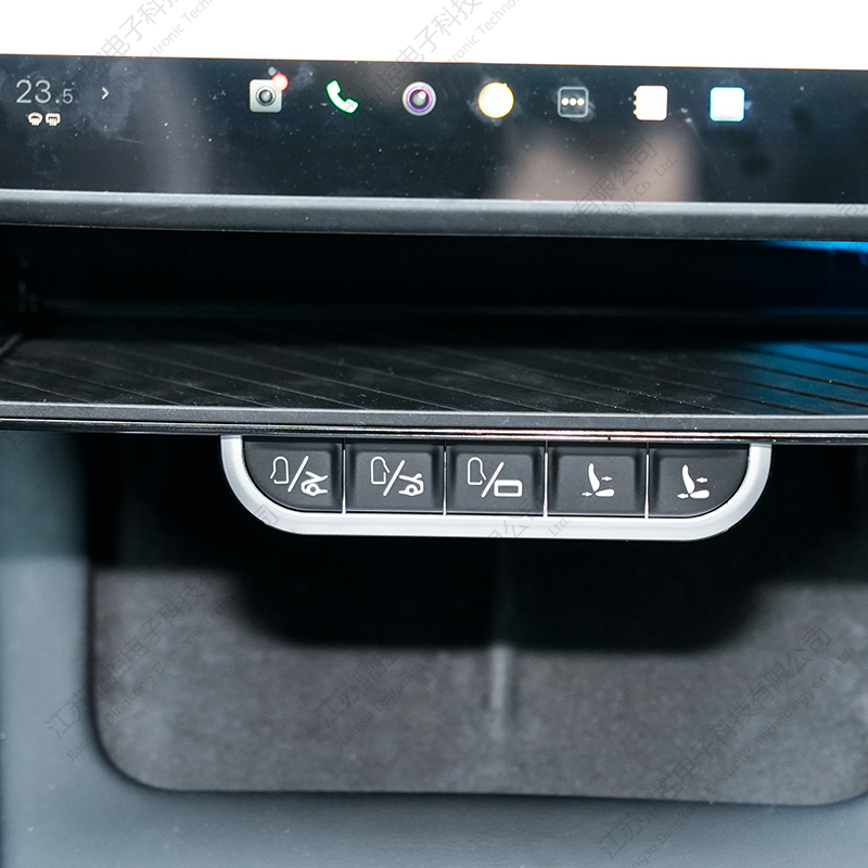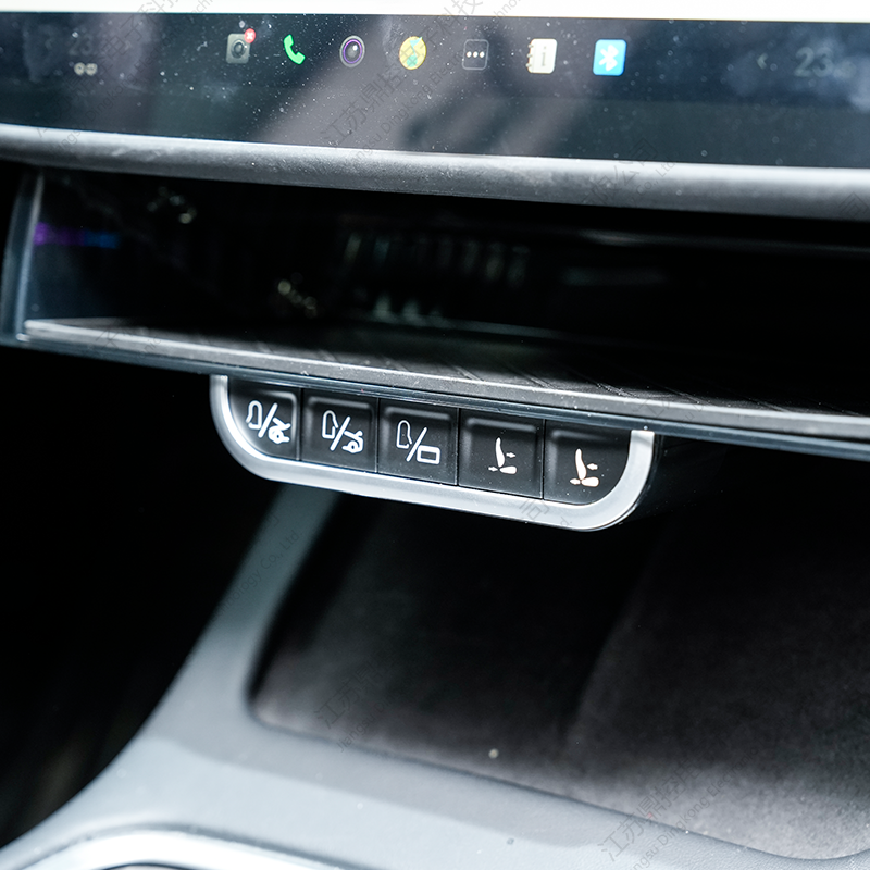 Pod półką umieszczono pięć dotykowych, metalowych przycisków, zapewniających intuicyjny dostęp do podstawowych funkcji pojazdu. Każdy przycisk reaguje wyraźnym kliknięciem, dając użytkownikom solidne poczucie kontroli. Funkcje obejmują otwieranie i zamykanie przednich drzwi, przedniego i tylnego bagażnika oraz kontrolowanie pokrywy portu ładowania – wszystko to jest natychmiast dostępne na wyciągnięcie ręki.